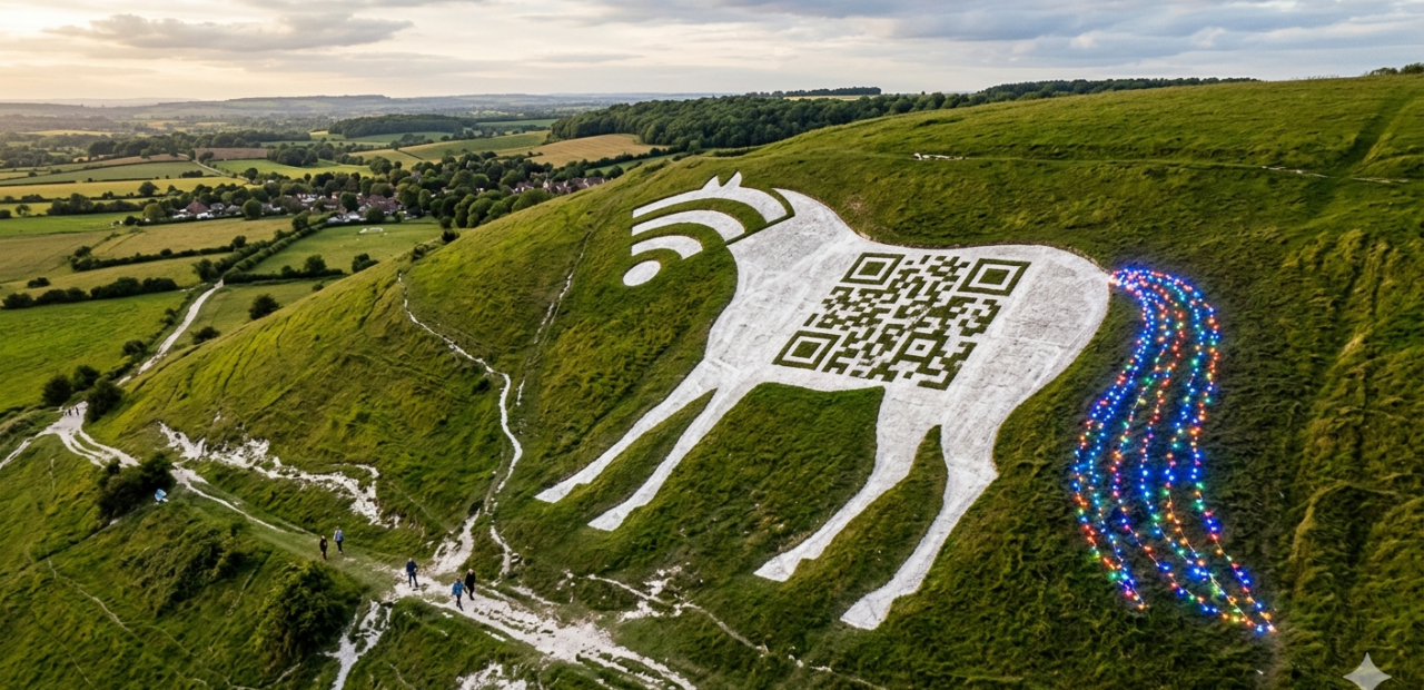 The project, titled Operation Digital Gallop, aims to modernize the 18th-century chalk figure by carving a massive, functional QR code into the side of Bratton Camp.